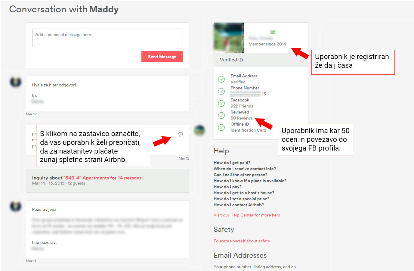 Namig: Kot uporabnik Airbnb ste v procesu rezervacije in plačila zaščiteni samo, dokler celotna rezervacija in postopek plačila potekata IZKLJUČNO prek njihove spletne strani. Če vas kdo skuša prepričati, da plačate kako drugače, v njegovem sporočilu kliknite ikono z zastavico – s tem boste prijavili sumljivo vsebino in administratorji strani bodo uporabnika preverili in po potrebi blokirali. - Goljufi lahko z vami komunicirajo z elektronskimi poštnimi naslovi, ki so zelo podobni uradnim Airbnb naslovom; info(at)airbnbpayments.com, airbnb(at)transactions.com …, a naj vas to ne zavede, saj gre za goljufe, ki se izdajajo za Airbnb.